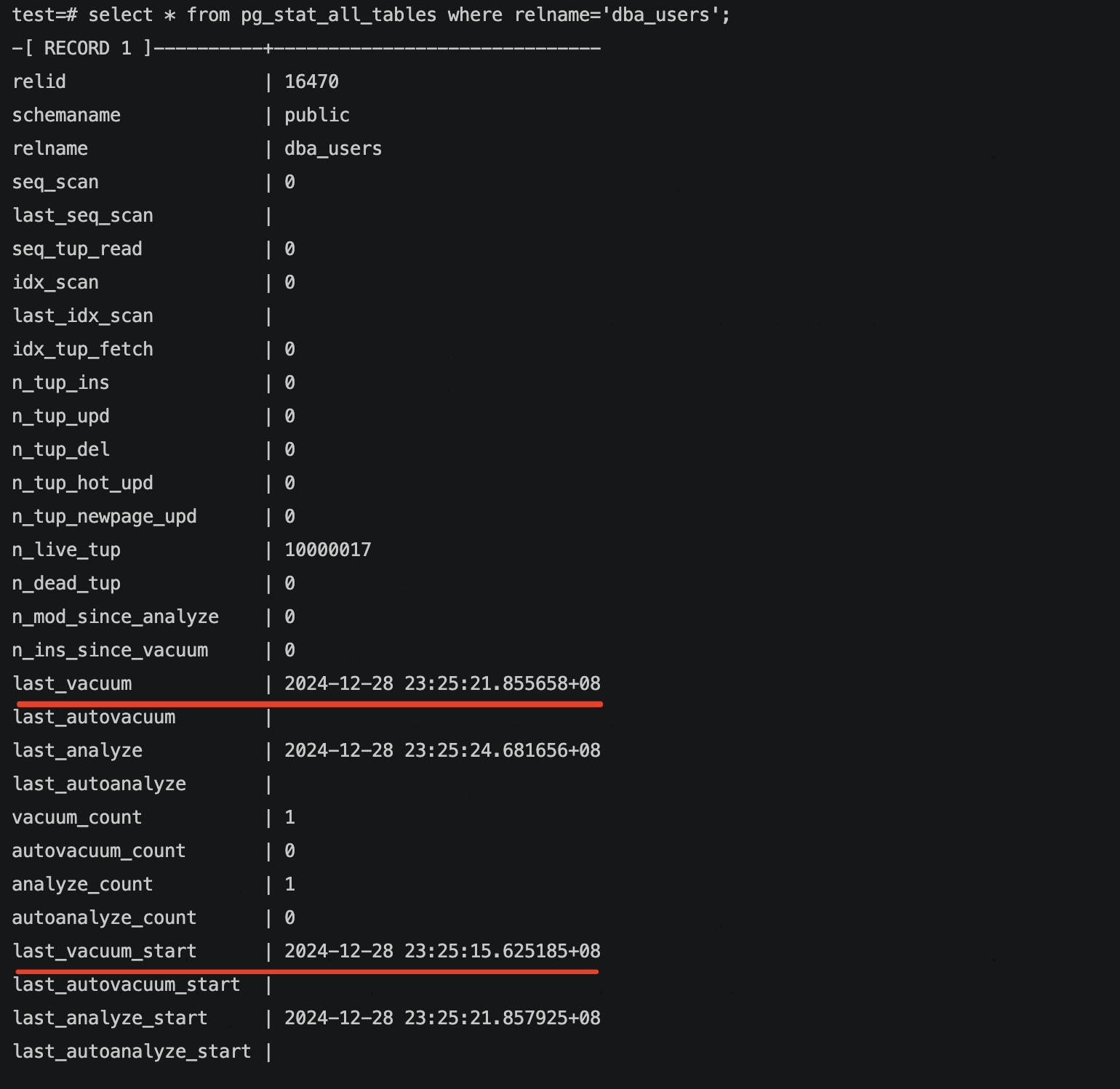However, this could still indicate whether a vacuum is in progress (if last_(auto)vacuum_start is more recent than last_(auto)vacuum, it means a vacuum is ongoing). While it is possible to monitor vacuum activity through the pg_stat_progress_vacuum view, this view itself does not record timestamps, so additional views might be needed, which would be less convenient than querying pg_stat_all_tables directly.