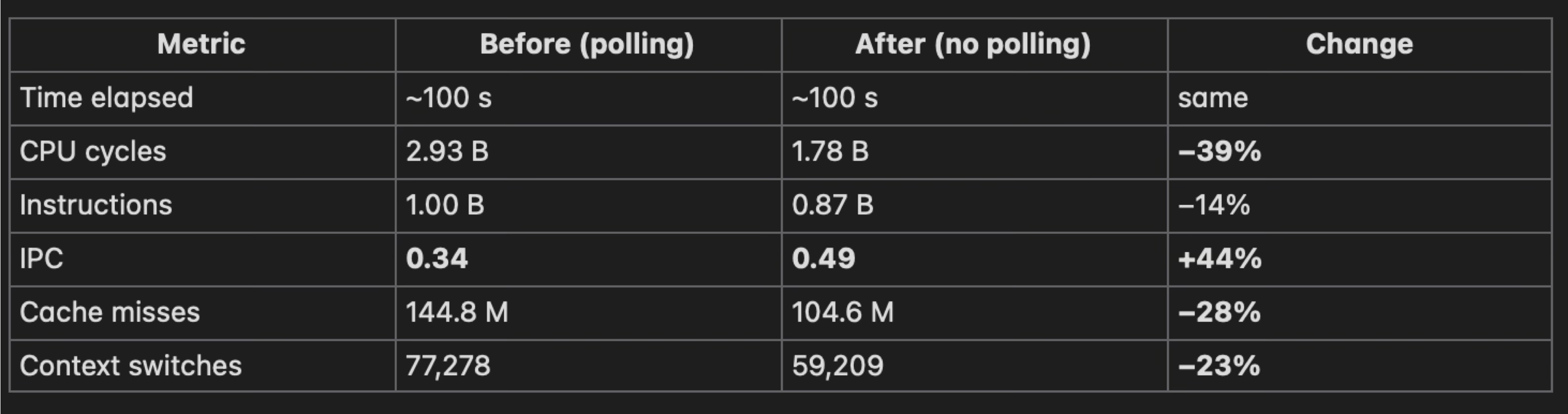 POC patch that swaps polling for CVs, but a single global CV (or even