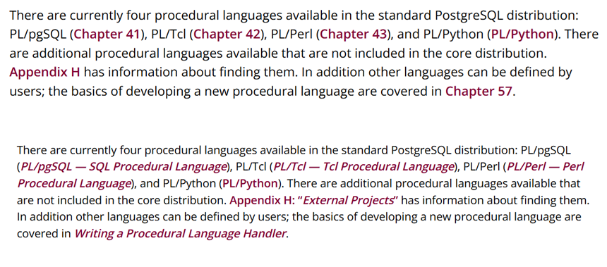 There are currently four procedural languages available in the standard PostgreSQL distribution: PL/pgSQL, PL/Tcl, PL/Perl and PL/Python.So I don't care if that link is a section, a appendix, a chapter, I'm sure I'll go there only if I really want.