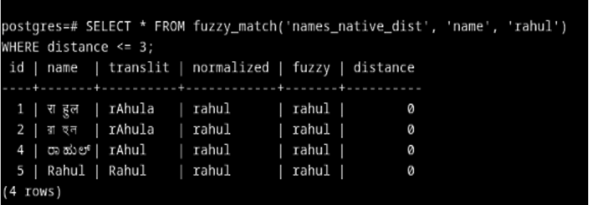 SELECT * FROM fuzzy_match('names_native_dist', 'name', 'Rahul')