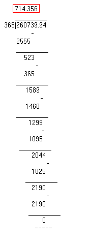 select (260739.94::double precision * (1.00::double precision / 365.00::double precision) )