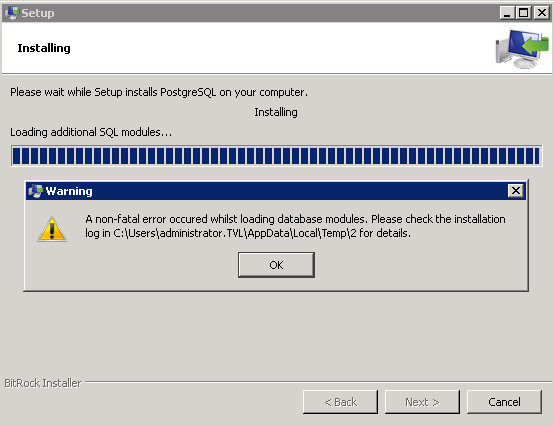 Failed to install the 'adminpack' module in the 'postgres' database