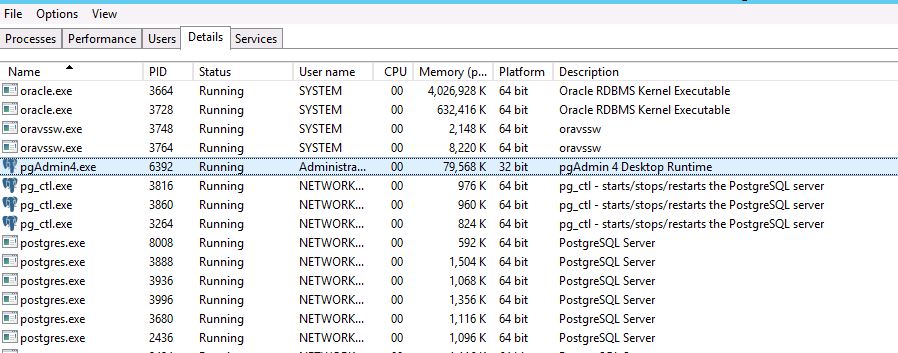 Please find the attached screen shot of the task manager which clearly shows that it’s the 32bit.pgAdmin is *NOT* Postgres and the screenshot clearly shows that you are running a 64bit Postgres server.