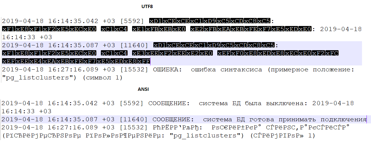 LOG: database system is ready to accept connectionsAll my databases have encoding=UTF8, collate=Russian_Russia.1251,