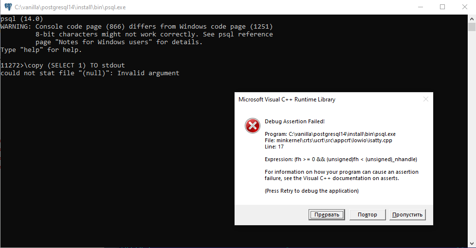 And this command with "stderr" works in PSQL without crash (in