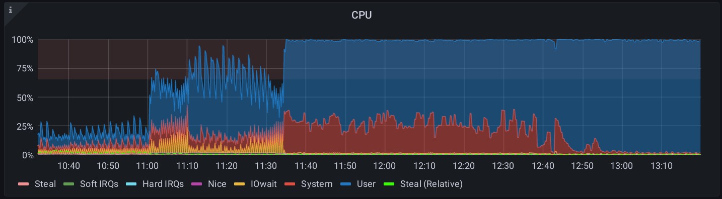 - 11:34 delete finished and instantly CPU went to ~70% user and ~30% system
