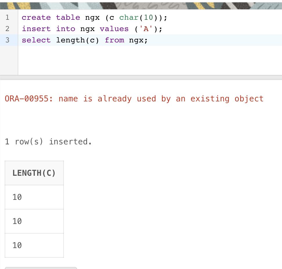insert into ngx_char (charcol, varcharcol) values ('A ', 'A ');