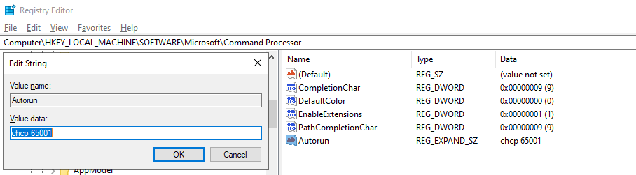 -> *Removed the *Value data(chcp 65001)* content.[image: image.png]