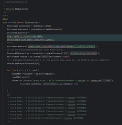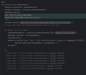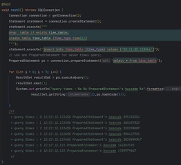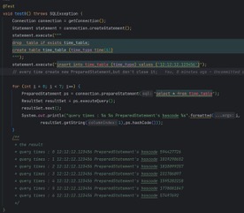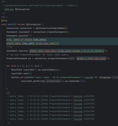 I find the time type accuracy of the database. Using PreparedStatement, the accuracy found out for the sixth time is different from the first five times. This number is exactly the same as the threshold of the PreparedStatement. I can understand that the database can optimize PreparedStatements and reduce repeated parsing and other unnecessary operations. but I don’t quite understand how such processing will affect the execution results(Or maybe I don’t have a deep understanding of PreparedStatement.). now I run the code and get some results;