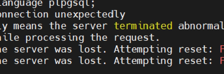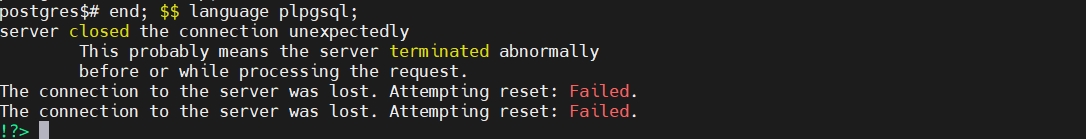 3 a loop in plpgsql,which wil result disconnection. do $$ declare var1 integer; begin for id in 1 .. 10000000 LOOP set search_path to test_schema; var1 = test_schema.test_f(id); set search_path to public; var1 = test_schema.test_f(id); end loop; end; $$ language plpgsql;