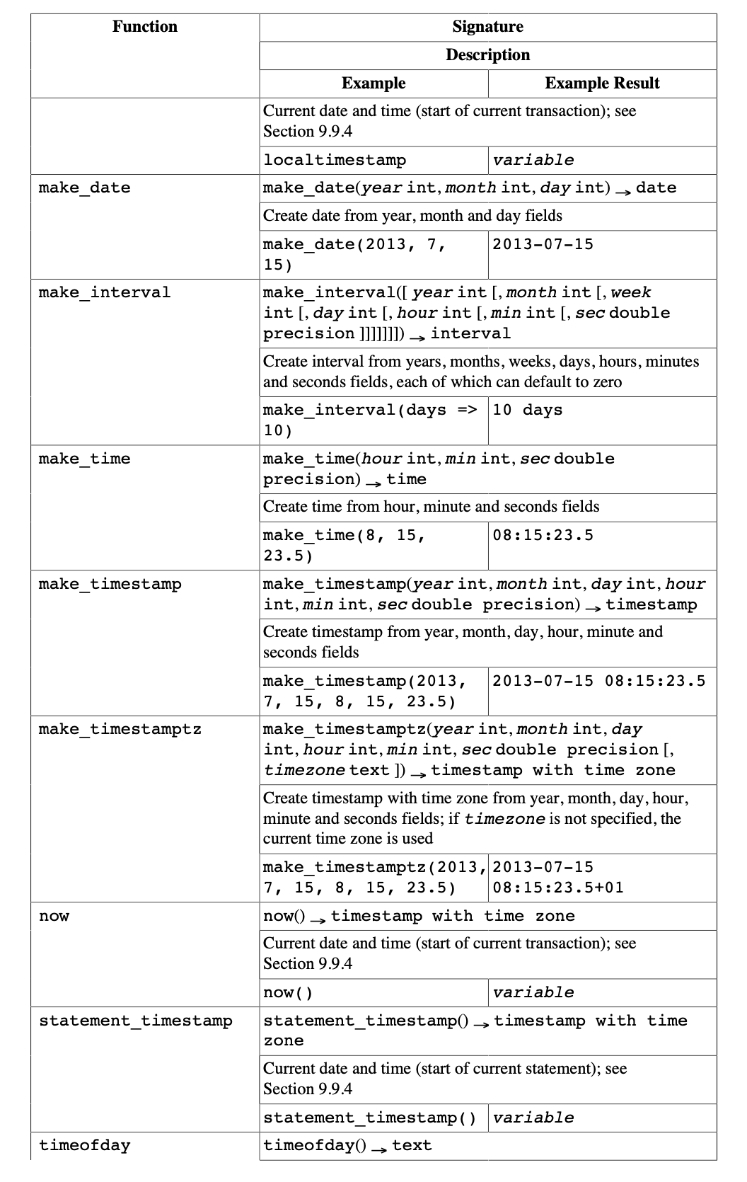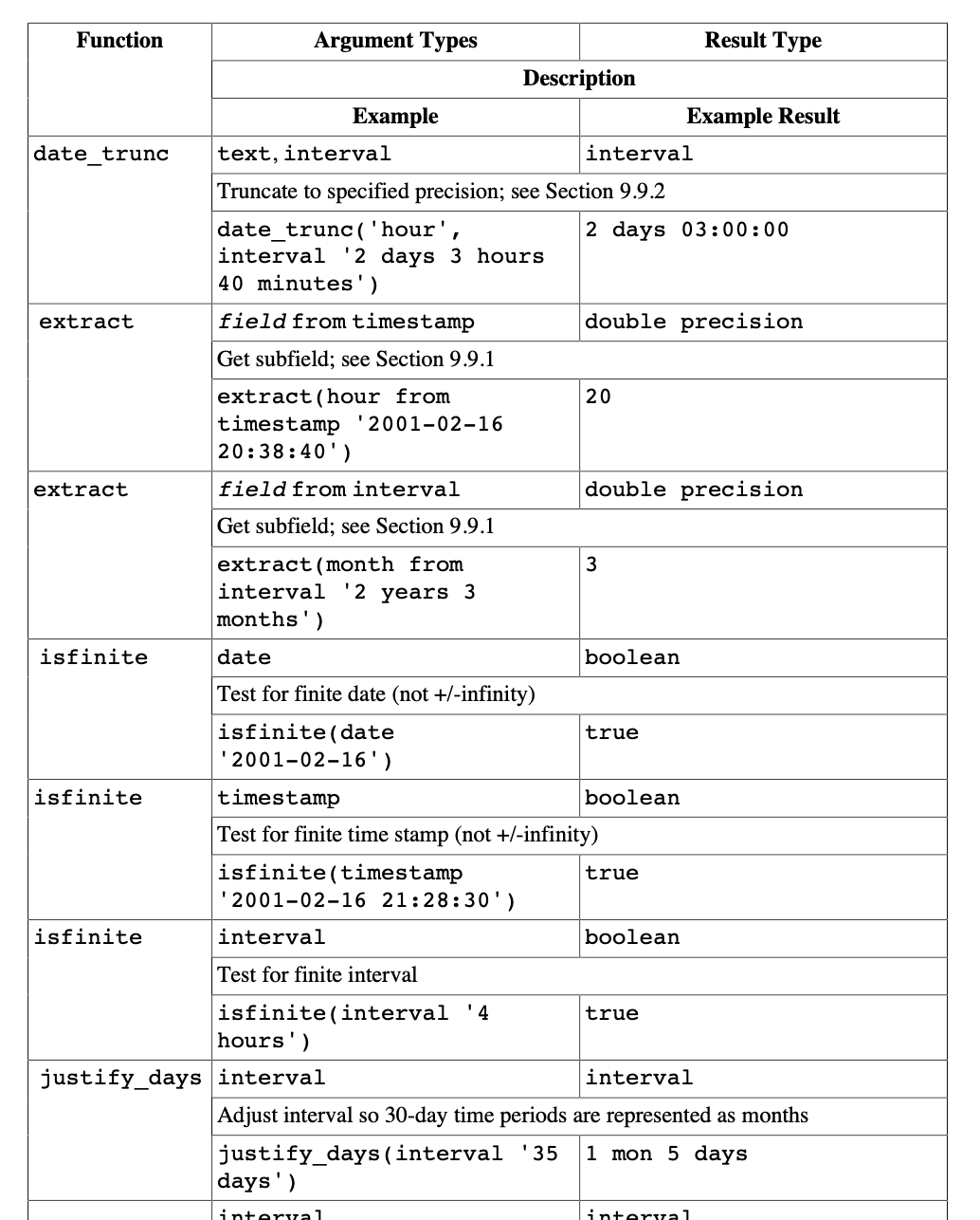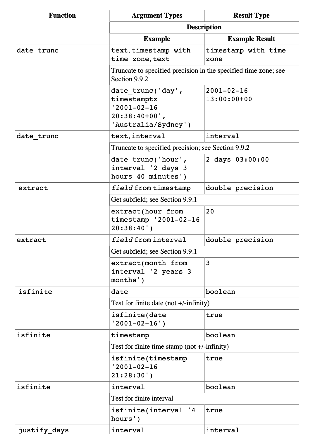 functions (or rather the family of functions that share a name like this:https://www.postgresql.org/docs/devel/functions-datetime.html#FUNCTION-DATE-PART