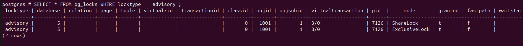 postgres=# SELECT * FROM pg_locks WHERE locktype = 'advisory';
