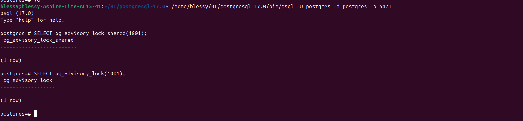 Type "help" for help.postgres=# SELECT pg_advisory_lock_shared(1001); //initialising the shared