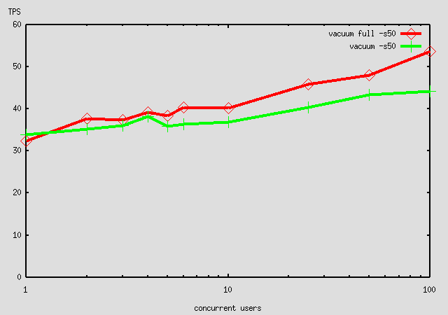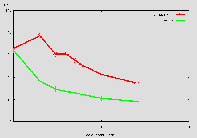1-25 concurrent backends and 10000 trx per runVACUUM and VACUUM FULL will provide the same starting state as far as